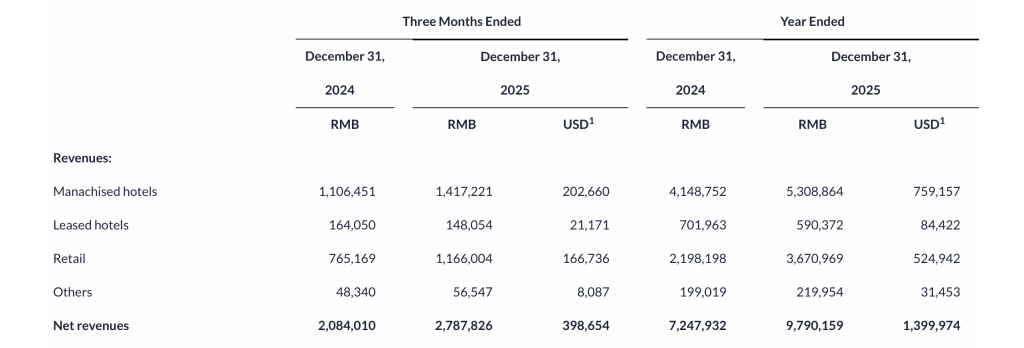 值得一提的是,2025年亚朵来自零售收入占净收入的占比约41.8%,同比增长5个百分点。